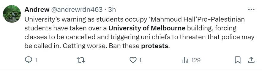 "University’s warning as students occupy ‘Mahmoud Hall’Pro-Palestinian students have taken over a University of Melbourne building, forcing classes to be cancelled and triggering uni chiefs to threaten that police may be called in. Getting worse. Ban these protests," says another message on the X platform.