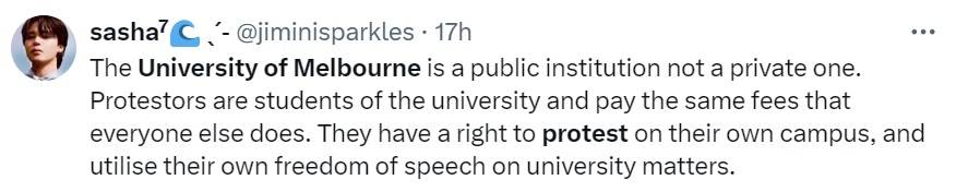 "The University of Melbourne is a public institution not a private one. Protestors are students of the university and pay the same fees that everyone else does. They have a right to protest on their own campus, and utilise their own freedom of speech on university matters," said another message.