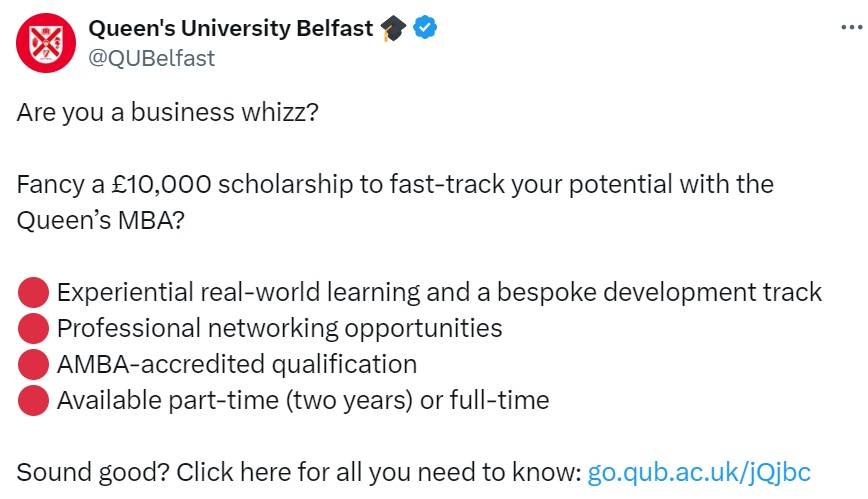 Queen's University Belfast offers £10,000 scholarship for MBA program to International students