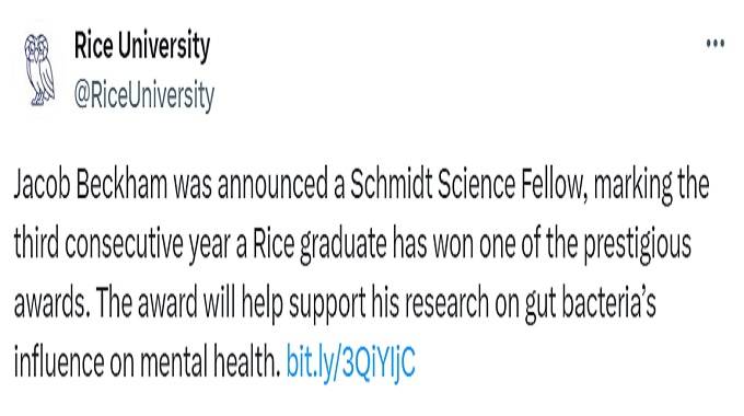 Jacob Beckham, a doctoral alumnus of Rice University was announced a Schmidt Science Fellow marking the third consecutive year a Rice graduate has won one of the prestigious awards. He earned his Ph.D. in chemistry in 2023. The award will help support his research on gut bacteria’s influence on mental health.