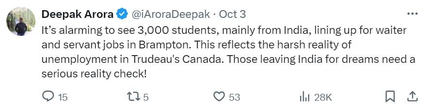 "Heartbreaking scenes from Brampton: 3,000 students, mostly Indian, line up for waiter jobs after a single restaurant opening. Is Trudeau's Canada the land of opportunity or broken dreams?," says another message on X.
