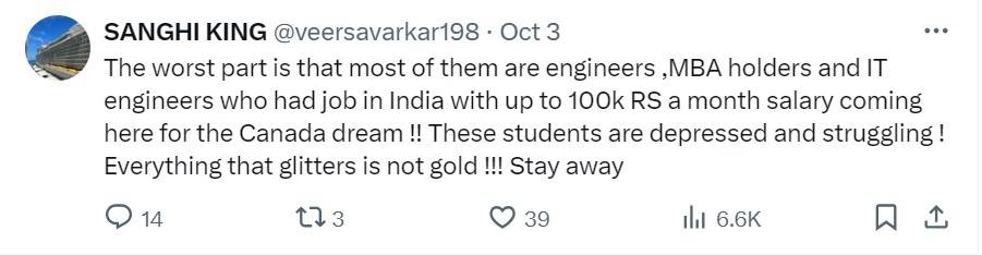 "The worst part is that most of them are engineers ,MBA holders and IT engineers who had job in India with up to 100k RS a month salary coming here for the Canada dream !! These students are depressed and struggling ! Everything that glitters is not gold !!! Stay away," said yet another message.