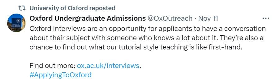 "Oxford interviews are an opportunity for applicants to have a conversation about their subject with someone who knows a lot about it. They’re also a chance to find out what our tutorial style teaching is like first-hand," reads the message on X by Oxford Undergraduate Admissions.