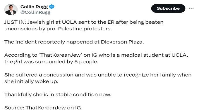 "Jewish girl at UCLA sent to the ER after being beaten unconscious by pro-Palestine protesters. The incident reportedly happened at Dickerson Plaza. According to ‘ThatKoreanJew’ on IG who is a medical student at UCLA, the girl was surrounded by 5 people. She suffered a concussion and was unable to recognize her family when she initially woke up. Thankfully she is in stable condition now. Source: ThatKoreanJew on IG," said a message on X.