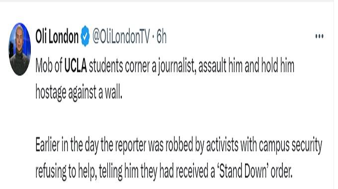 "Mob of UCLA students corner a journalist, assault him and hold him hostage against a wall. Earlier in the day the reporter was robbed by activists with campus security refusing to help, telling him they had received a ‘Stand Down’ order," said another message on X.