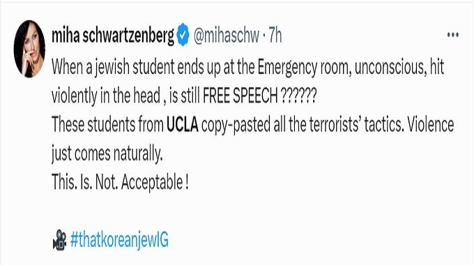 “When a jewish student ends up at the Emergency room, unconscious, hit violently in the head , is still FREE SPEECH ?????? These students from UCLA copy-pasted all the terrorists’ tactics. Violence just comes naturally. This. Is. Not. Acceptable !,” tweeted former TV journalist miha schwartzenberg.