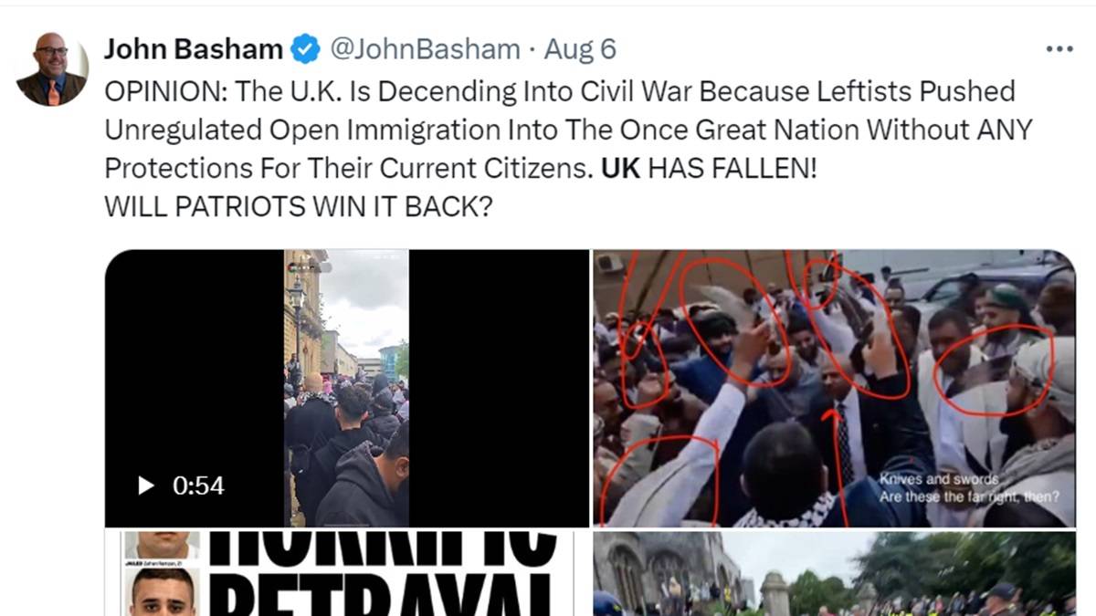 "OPINION: The U.K. Is Decending Into Civil War Because Leftists Pushed Unregulated Open Immigration Into The Once Great Nation Without ANY Protections For Their Current Citizens. UK HAS FALLEN! WILL PATRIOTS WIN IT BACK?," says one message on X.