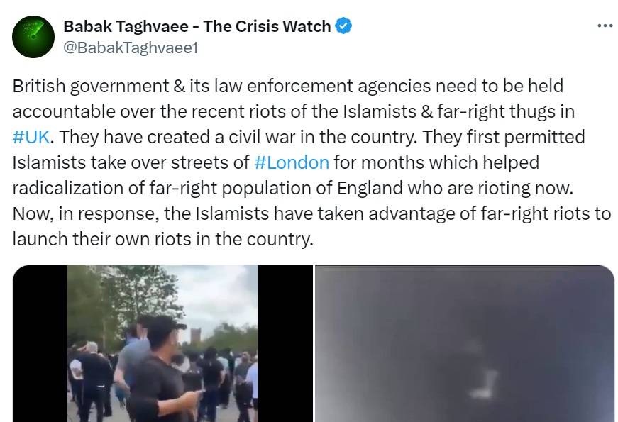 "British government & its law enforcement agencies need to be held accountable over the recent riots of the Islamists & far-right thugs in #UK. They have created a civil war in the country. They first permitted Islamists take over streets of #London for months which helped radicalization of far-right population of England who are rioting now. Now, in response, the Islamists have taken advantage of far-right riots to launch their own riots in the country," said another message on X.