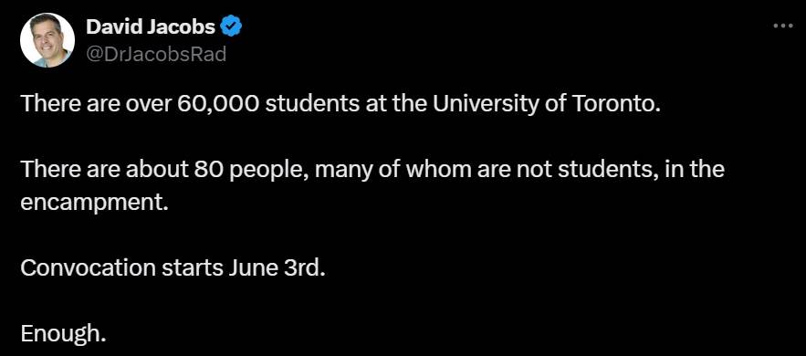 "There are over 60,000 students at the University of Toronto. There are about 80 people, many of whom are not students, in the encampment. Convocation starts June 3rd. Enough," reads a message.