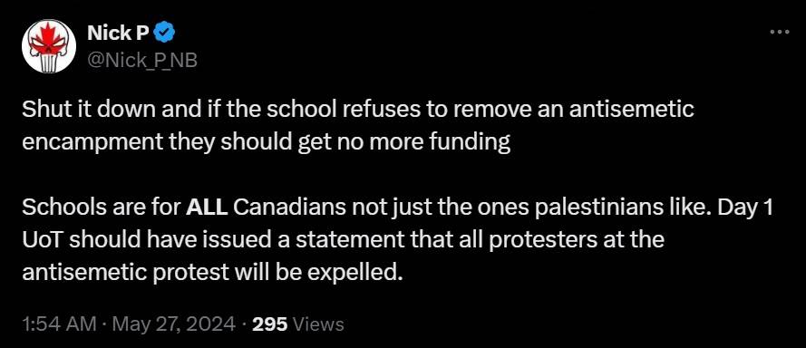 "Shut it down and if the school refuses to remove an antisemetic encampment they should get no more funding Schools are for ALL Canadians not just the ones palestinians like. Day 1 UoT should have issued a statement that all protesters at the antisemetic protest will be expelled," said another message on X.