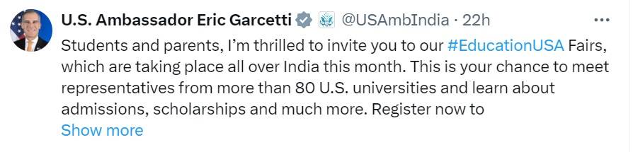 "Students and parents, I’m thrilled to invite you to our #EducationUSA Fairs, which are taking place all over India this month. This is your chance to meet representatives from more than 80 U.S. universities and learn about admissions, scholarships and much more. Register now to make your dream of studying in the U.S. a reality: https://bit.ly/EdUSAFair24Emb #USIndiaFWD," reads his message on X platform.