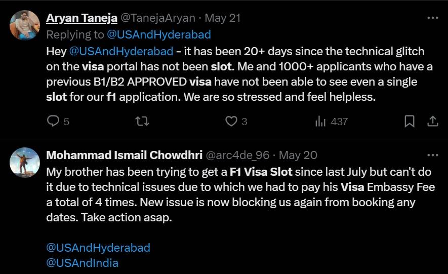 “Hey @USAndHyderabad - it has been 20+ days since the technical glitch on the visa portal has not been slot. Me and 1000+ applicants who have a previous B1/B2 APPROVED visa have not been able to see even a single slot for our f1 application. We are so stressed and feel helpless,” says one of the messages.