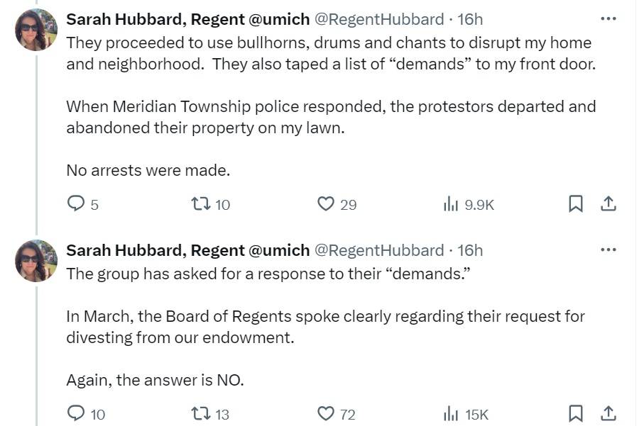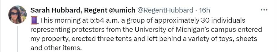 "This morning at 5:54 a.m. a group of approximately 30 individuals representing protestors from the University of Michigan’s campus entered my property, erected three tents and left behind a variety of toys, sheets and other items,” she said on X platform.