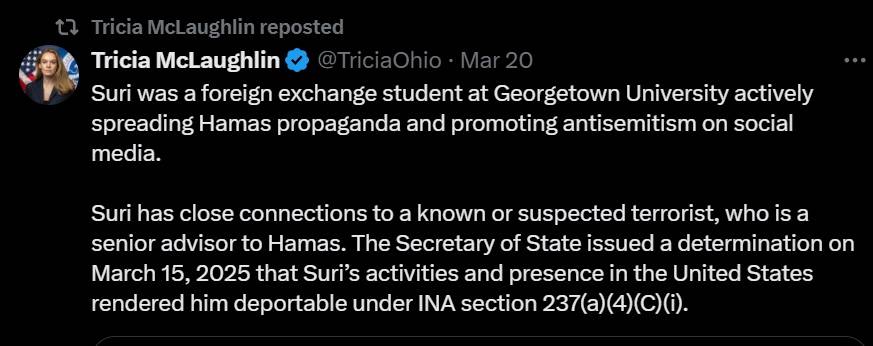 US Department of Homeland Security spokesperson Tricia McLaughlin said on X platform, "Suri was a foreign exchange student at Georgetown University actively spreading Hamas propaganda and promoting antisemitism on social media. Suri has close connections to a known or suspected terrorist, who is a senior advisor to Hamas. The Secretary of State issued a determination on March 15, 2025, that Suri’s activities and presence in the United States rendered him deportable under INA section 237(a)(4)(C)(i)."