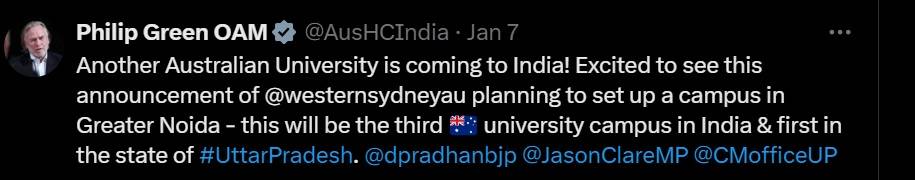 He said, "Another Australian University is coming to India! Excited to see this announcement of @westernsydneyau planning to set up a campus in Greater Noida - this will be the third university campus in India & first in the state of #UttarPradesh."