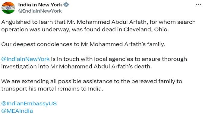 "Anguished to learn that Mr. Mohammed Abdul Arfath, for whom search operation was underway, was found dead in Cleveland, Ohio. Our deepest condolences to Mr Mohammed Arfath’s family. @IndiainNewYork is in touch with local agencies to ensure thorough investigation into Mr Mohammed Abdul Arfath’s death. We are extending all possible assistance to the bereaved family to transport his mortal remains to India," reads the message by the Consulate General of India in New York on X platform.
