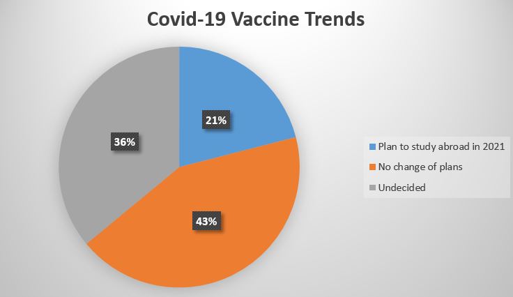 Another recent research conducted by QS that surveyed 887 prospective international students from China, India, Pakistan, the UK, and the US showed that 21% of respondents considered bringing their study abroad plans forward with the introduction of a potential COVID-19 vaccine, while 43% expressed no desire to change their plans just yet. While the undecided are hopeful that things will go back to normal with the actual availability of the vaccine in 2021 thus displaying a promising trend as far as studying abroad 2021 is concerned with the availability of the Covid-19 Vaccine on the horizon.
