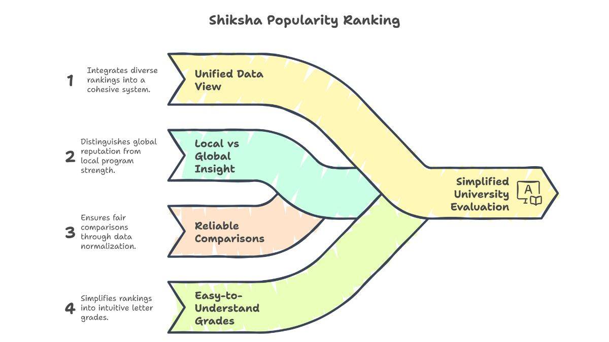 Shiksha Popularity Rank is a simple ranking system that helps you choose the best university for studying abroad. It collects ratings from trusted sources and turns them into an aggregated rank with clear letter grade, so you can see how well an institute performs overall and for specific courses. It even breaks down the rankings into different levels: