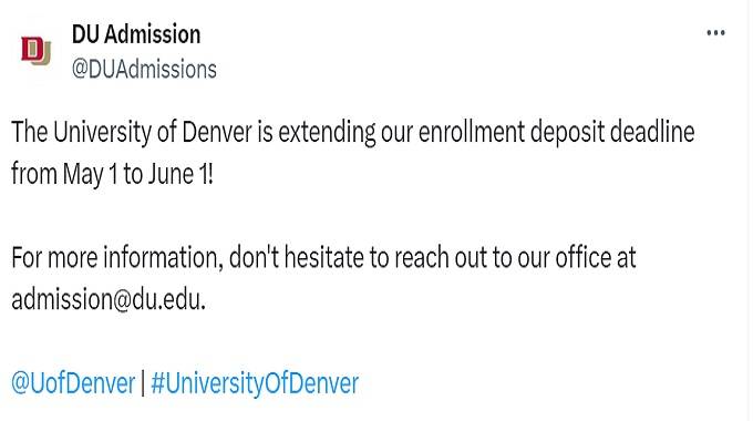 "The University of Denver is extending our enrollment deposit deadline from May 1 to June 1! For more information, don't hesitate to reach out to our office at admission@du.edu," reads the message by the University of Denver on X platform.