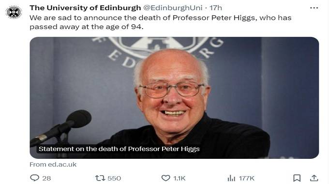 - Nobel-winning physicist Peter Higgs dies: University of Edinburgh