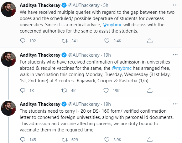 Maharashtra Guardian Minister Aaditya Thackeray tweeted this information on Friday through his Twitter account. He also said that he will be speaking to other municipal corporations across the state to implement the same for students who received confirmation about their admission from universities abroad.