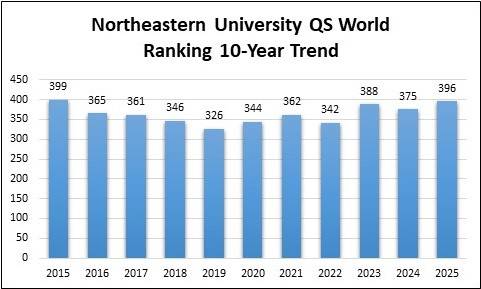 Northeastern University is known to be one of the top ranked universities in USA and worldwide. The university has been ranked at #396 in 2025 and #375 in 2024 according to the Quacquarelli Symonds Rankings. It is also known for its academic research and global opportunities that are offered to international students. The change in rankings for Northeastern University throughout the recent years is given in the graph below: