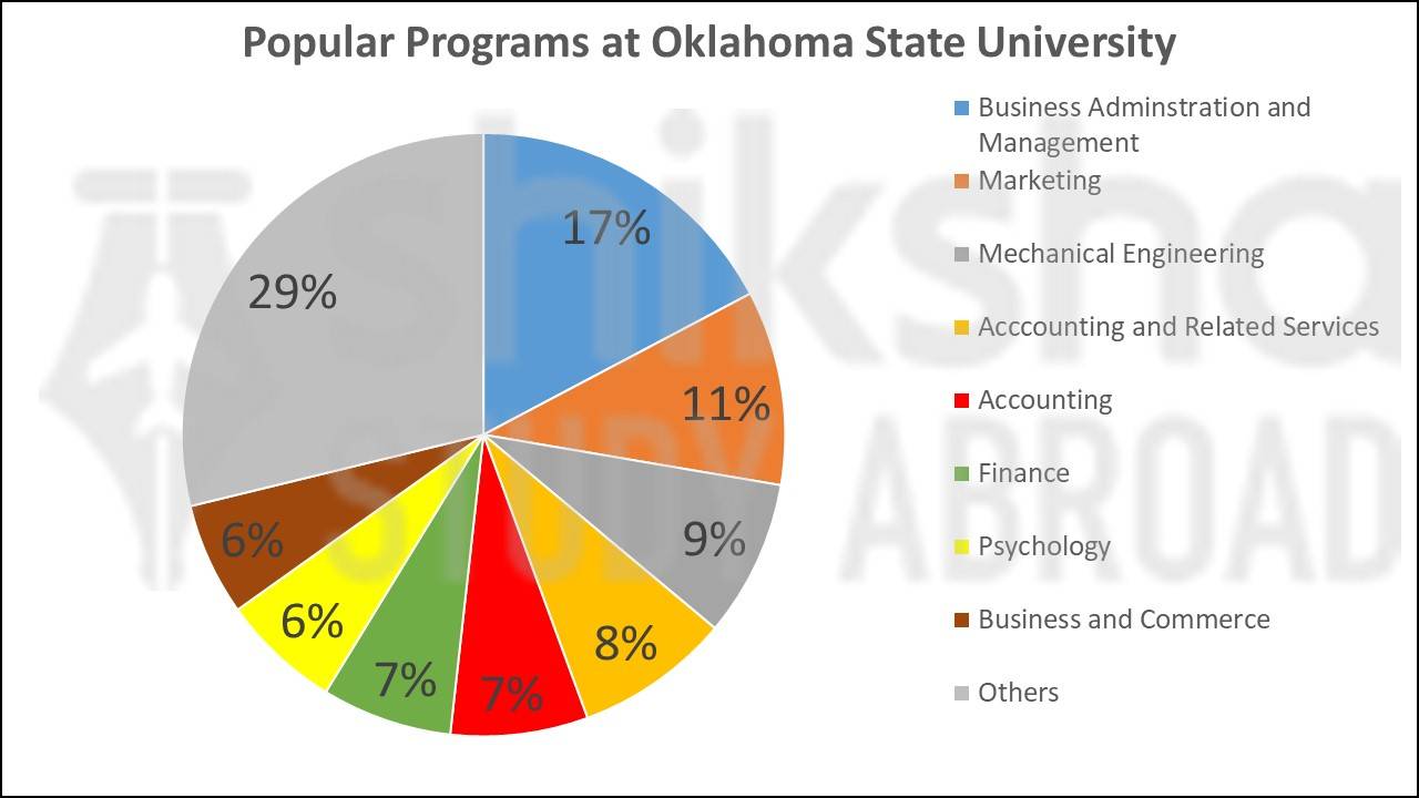 OK State in USA has seven academic colleges, plus a Vet. school and an Osteopathic Medical School. It offers 300+ UG courses, 79 Master's degree programs, and 45 Doctoral programs. As per the unofficial sources, a few of the popular majors are Business, Psychology, Marketing, Finance, Mechanical Engineering, Accounting, etc.