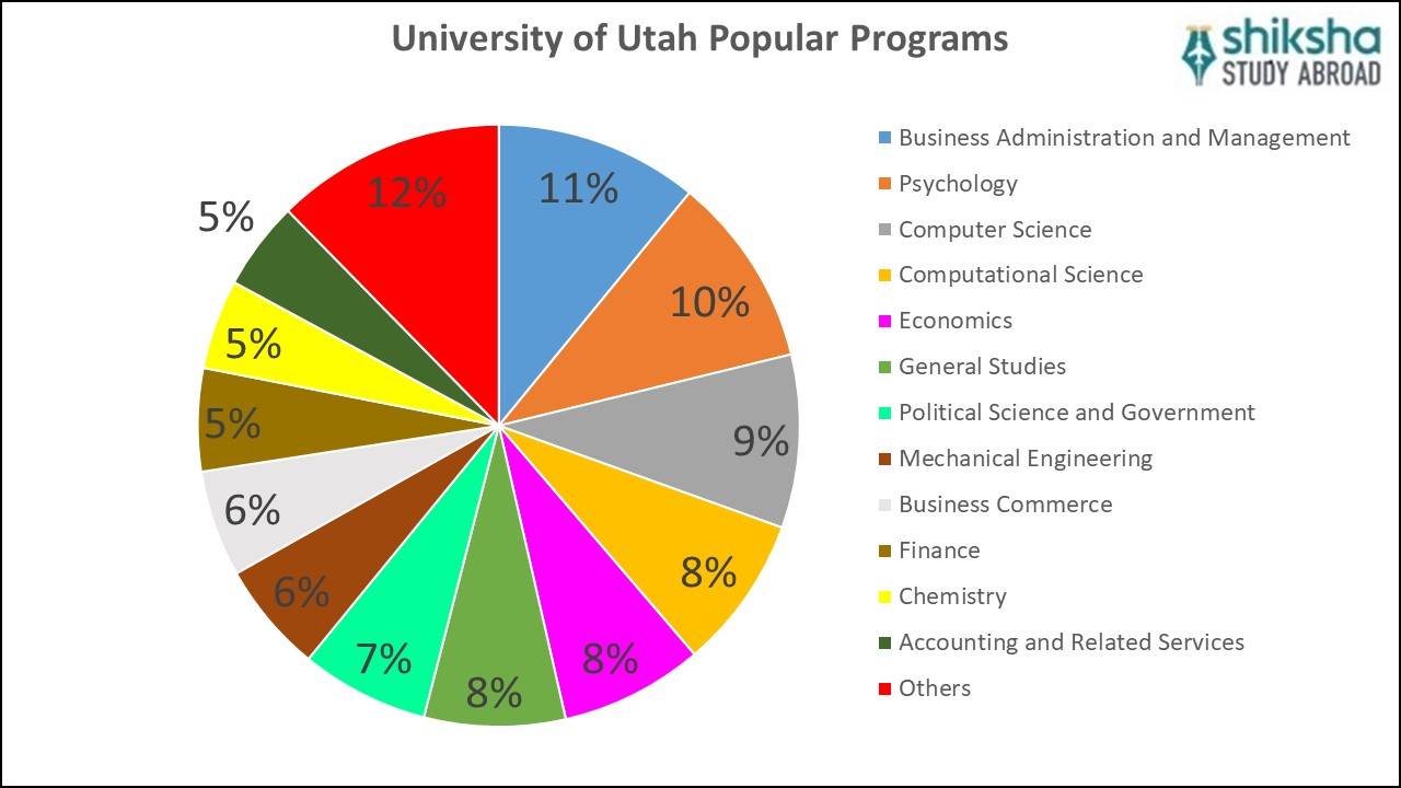 The University of Utah offers over 200 majors, minors, and certificate programs for international students. Utah University courses are offered through 18 colleges and schools along with nearly 100 departments. Various colleges and schools of the University of Utah are given below. The pie chart mentioned below includes the subject chosen by the University of Utah alumni: