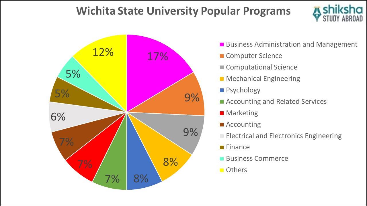Wichita State University offers more than 200 academic programs in specializations, such as Business Analytics; Business Administration; Management Science, and Supply Chain Management, etc. The Wichita State University tuition ranges between INR 14 L and INR 16 L for undergraduates and from INR 9 L