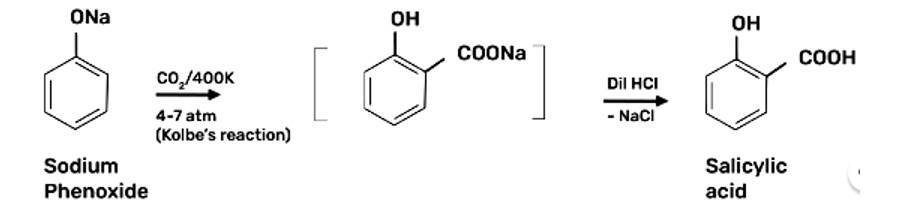 Step 2: Sodium Phenoxide undergoes Kolbe's reaction at high temperature and pressure in presence of carbon dioxide (CO2) gas. The product is further hydrolysed to obtain salicylic acid.