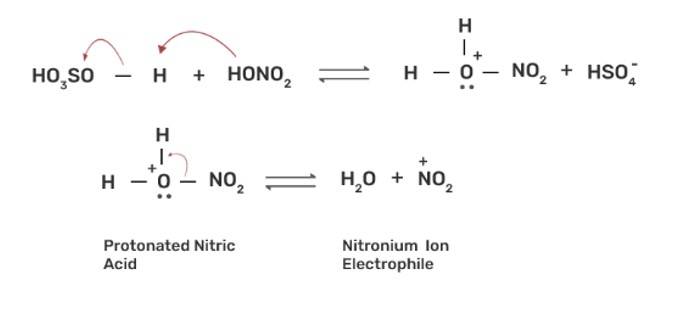 The nitration of aromatic compounds occurs by using HSO4 and HNO3 which leads to the formation of NO2+ (nitronium ion) electrophile.