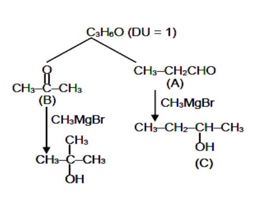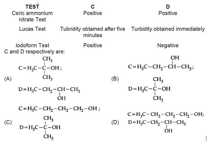 gives iodoform test and slow Lucas test, so it's a methyl secondary alcohol. D gives fast Lucas test, so it's a tertiary alcohol. The Grignard products must be tertiary and secondary alcohols. So A and B must be an aldehyde and a ketone.