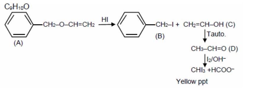 HI cleavage of ether. B is CH? =CHI, gives yellow PPT with AgNO? C is C? H? CH? OH.
