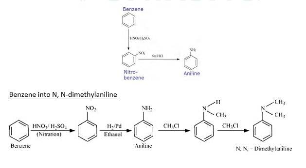 When Benzene is reacted with nitrating mixture it forms nitrobenzene. When it Reduced H2/Pd in ethanol or Sn/HCl, it forms Aniline. When Aniline reacts 2 times with CH3Cl It forms N, N- dimethylaniline.