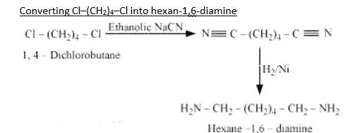 When 1,4-dichlorobutane reacts with NaCN it forms Di cyanide compound, After Hydrogenation it forms the Hexane 1,6-Diamine.