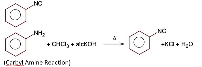 Primary amine, whether aliphatic or aromatic when warmed with CHCl3, alcoholic (KOH) it forms isocyanide