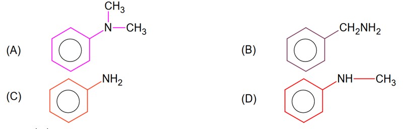 Lone pair is localized in (A) while all 3 have delocalized lone pair but they can be compared by 3° > 2° > 1° because methyl group increases the basicity.