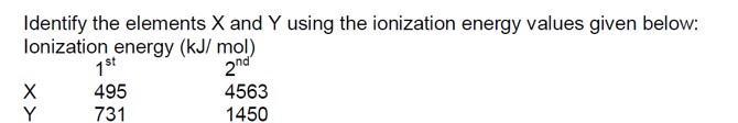 The difference between the first and second ionization energies is significantly higher for alkali metals (like Sodium, Na) compared to alkaline earth metals (like Magnesium, Mg). Therefore, in the context of the problem, X=Na and Y=Mg.