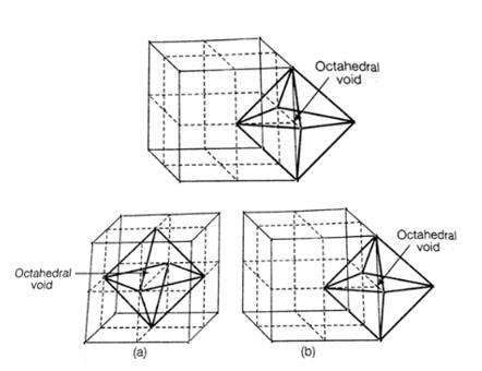 1. When any atom is surrounded by six atoms it creates an octahedral void. In fcc, body centre is surrounded by six atoms present at the face centre. And hence one octahedral void is present at the body centre of each unit cell.