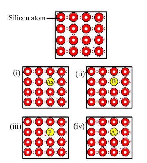 61. Options (i) and (iii) are correct since n-type semiconductors are prepared by doping silicon with pentavalent elements of group 15 (like P or As). Some of the lattice sites in silicon crystals are occupied by the fifth electron which is left over as extra electron and couldn't form a bond with the tetravalent Silicon and hence the images (i) and (iii) are showing this situation and hence representing n-type semiconductor.
