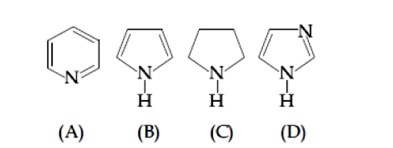 B is least basic as lone pair of electron is present in resonance so as to make the system aromatic in nature
