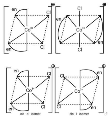 Ans: [M (AA)2X2]n + is a bidentate ligand and %X is a monodentate ligand. It is an example of octahedral geometry as well as an ion. There are cis and trans isomers of this ion. Trans isomers are symmetrically active, while cis isomers are optically active.