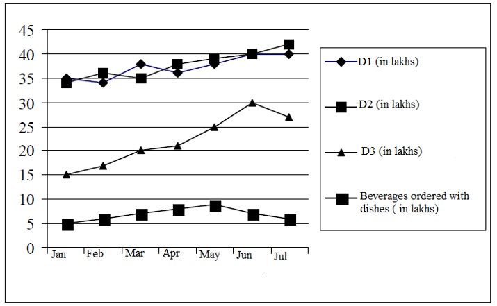 The difference between the sum of D1 and D2 dishes is maximum in the month of July. So, with respect to the sum of D1 and D2 dishes least beverages order in month of July.