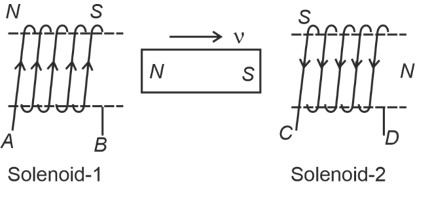North of magnet is moving away from solenoid 1 so end of solenoid 1 is South and as south of magnet is approaching solenoid 2 so end of solenoid 2 is South.