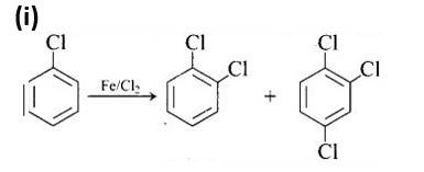 The first reaction is an electrophilic substitution process in which Cl+ from the Cl2 and FeCl3 combination attacks and substitutes the benzene ring.