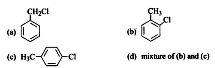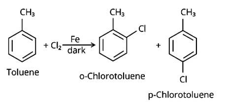 By electrophilic substitution, aromatic arenes react with chlorine in the presence of Lewis acid catalysts such as iron (III) chloride, yielding ortho and para isomers of haloarenes. (ii) and (iii) are both products of the reaction. Cl2 forms a coordination complex with FeCl3, creating the Cl + FeCl4 - complex, which has a small positive charge on Cl and a negative charge on FeCl4 - . This Cl+ then interacts with the aromatic double bonds of the toluene molecule to create an addition product, which is su