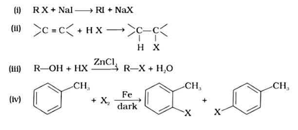 The correct answer is option (i). Option (i) is an example of a Finklestein reaction, which is a halogen exchange reaction that produces alkyl iodide by treating alkyl halides with NaI in dry acetone. Option (ii) is an addition reaction in which an alkene is transformed to the equivalent alkyl halide. Option (iii) is a substitution reaction, whereas option (iv) is an electrophilic substitution reaction.