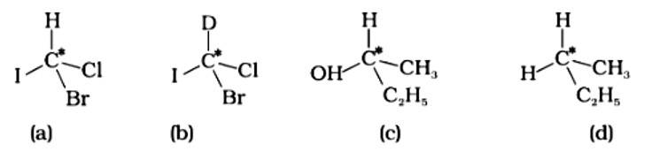 The correct answer is (ii).The mirror copies of the molecules (a), (b), and (c) are non-superimposable. Because all four species linked to the carbon atom are identical, molecule (d) cannot have an asymmetric carbon atom, thus the mirror image of (d) when rotated 180? is superimposable on the original picture.