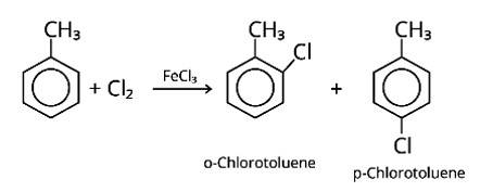 When an arene is treated with Cl2 in the presence of FeCl3, the electrophilic addition reaction chlorinates the arene to produce aryl chloride. As a result, the chemical provided is C6H5-CH3, often known as toluene. o-chlorotoluene and p-chlorotoluene are the results of electrophilic substitution chlorination.