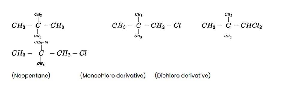 The alkane C5H12 is a hydrocarbon with a molecular mass of 72gmol?1. On photo-chlorination, the tert-isomer of pentane yields a single monochloro derivative and two dichloro derivatives. The following is the structure of the alkane and its chloride derivatives.